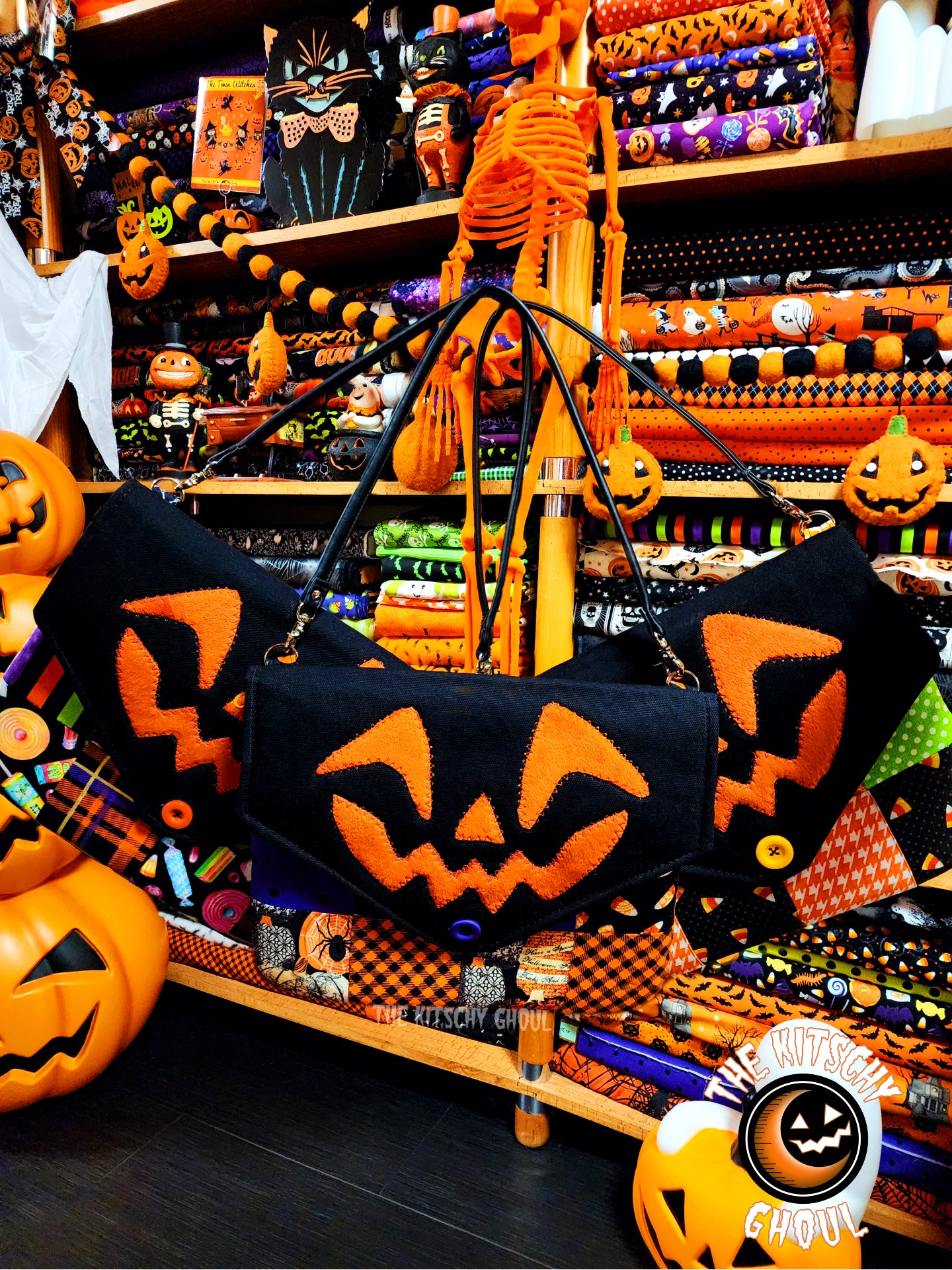Exterior shell consists of various printed 100% cotton patchwork squares. Top flap is 100% cotton canvas, with a polyester velvet pumpkin face. Lined in printed 100% cotton fabric. Strap material is PU vinyl.
